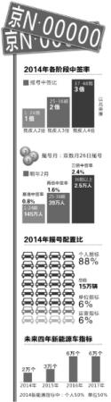 在60萬輛中,43萬個是普通小客車指標,17萬個為北京市示范應用新能源小客車指標。但是,這些指標並不是平均分配到4年中,17萬新能源車逐年按2萬、3萬、6萬、6萬的漸進式發展,相應的,43萬輛普通小客車分別以13萬、12萬、9萬、9萬遞減。