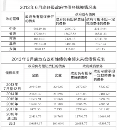 截至2013年6月底,中央政府負有償還責任的債務98129.48億元,負有擔保責任的債務2600.72億元,可能承擔一定救助責任的債務23110.84億元。
