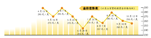東山百貨的相關負責人戴崇業介紹說,昨日的金價為廣州市場今年以來的第二個最低點,今年的最低點是在6月28日,當時東山百貨的千足首飾金價為299元/克。