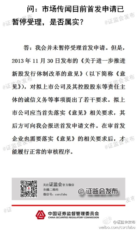 新華網消息 證監會官方微博12月3日回應,並未暫停受理首發申請。擬上市公司應當首先落實《關于進一步推進新股發行體制改革的意見》相關要求,其後方可報送首發申請文件。在審首發企業也需要落實《意見》的相關要求後,才能履行正常的審核程序。