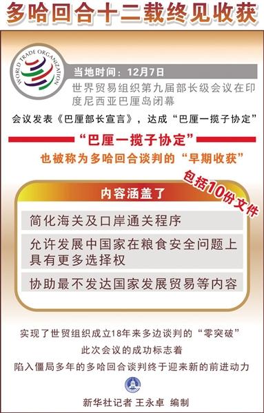 世界貿易組織第九屆部長級會議7日上午在印度尼西亞巴厘島閉幕,會議發表了《巴厘部長宣言》,達成“巴厘一攬子協定”。這是世貿組織成立18年來首份全球貿易協定,標志著多哈回合貿易談判12年僵局終獲歷史性突破。世貿組織總幹事羅伯托·阿澤維多在閉幕式上表示,“世貿組織歷史上首次迎來真正成果,”而這“強化了支持增長與發展的努力。”