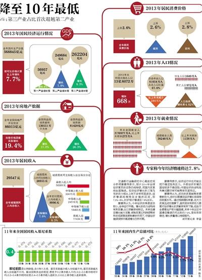 新京報訊 (記者李蕾)2013年GDP同比增7.7%,增速與上年持平,為14年最低。國家統計局1月20日發布數據顯示,初步核算,全年國內生產總值(GDP)568845億元,按可比價格計算,比上年增長7.7%。