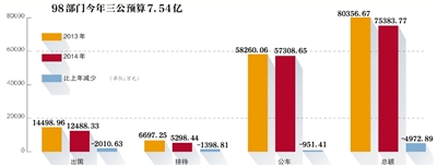 98個部門公布的三公經費預算中,公務接待費2014年預算比2013年預算減少的有96個部門,佔到所有部門的98%。2014年這些部門的公務接待費預算總計約5300萬元,比去年公布的預算減少約1400萬元。