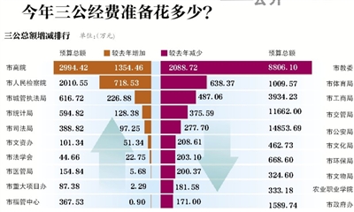 和往年相比,今年絕大多數部門三公經費明顯下降。比如市公安局盡管額度最高,但也比去年下降了277萬元;市教委下降2088萬元;市體育局下降638萬元。
