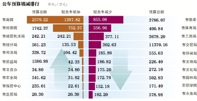 新京報記者統計發現,公開的98個部門中,有16個部門的公車購置和運行維護費,比去年增加。增加額度最高的是市高級人民法院,猛增了1397.82萬元,其中公車購置費從去年的0預算增了1143.72萬元。