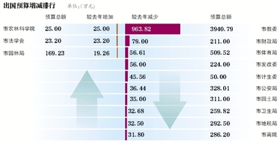 98部門中,有3個部門今年因公出國預算費用增加,分別是市農林科學院、市法學會、市園林綠化局,分別增加25萬元、23萬元和19萬元。