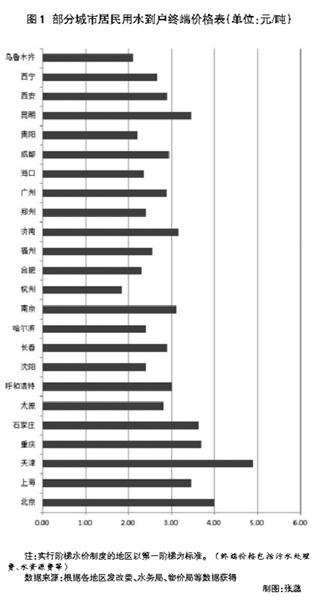 記者了解到,目前,我國主要城市的水價總體偏低。絕大部分居民用水終端價格大致范圍在3元~4元/立方米之間。(詳見圖1)