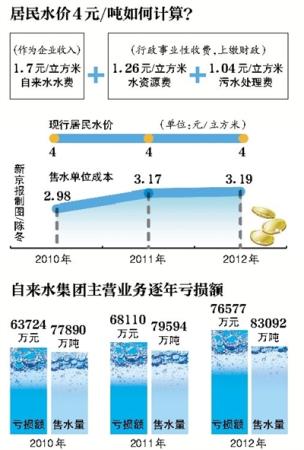 現行居民水價4元/立方米,即1.7元/立方米的自來水水費、1.26元/立方米的水資源費和1.04元/立方米污水處理費。按照企業3.19元的售水成本計算,居民每使用1立方米水,支付的4元水費中1.7元歸企業,那麼企業就要虧損1.49元。