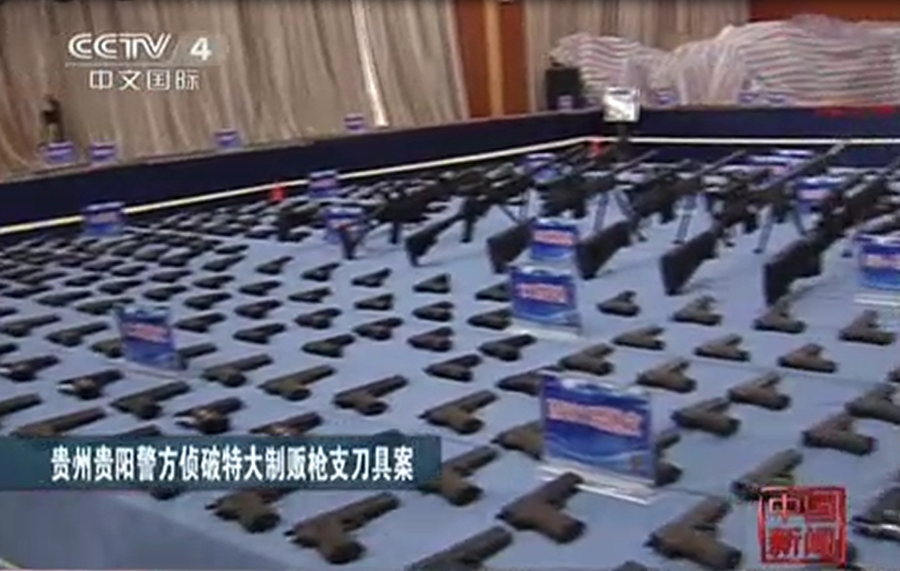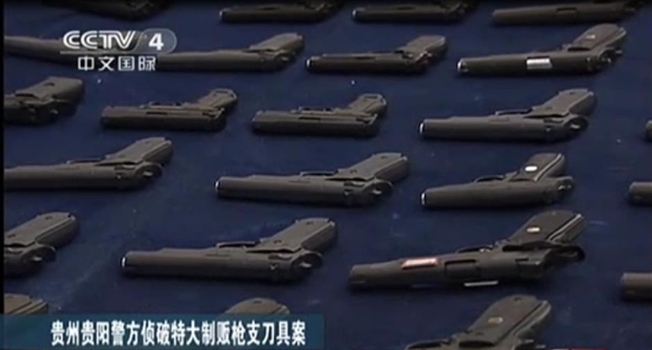近日,貴陽警方偵破了一起特大制造、販賣槍支、管制刀具的案件,共收繳槍支1萬5千支,管制刀具12萬把,目前有15名涉案的犯罪嫌疑人被警方抓獲,這個犯罪團夥的制販網絡覆蓋了湖南、廣東、四川、貴州等27個省、區、市。(視頻截圖)來源:央視