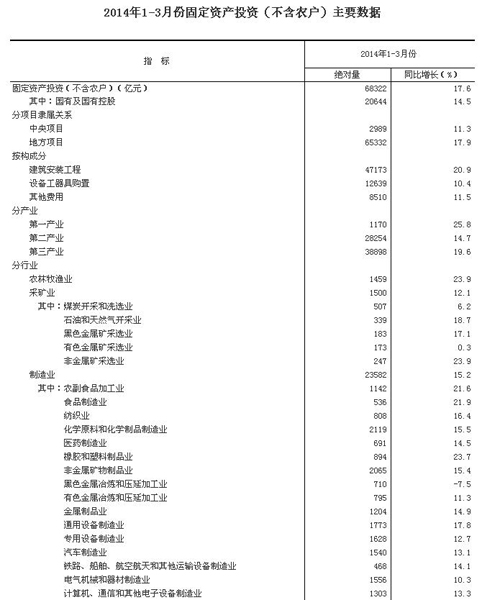 中新網4月16日電 據國家統計局網站消息,2014年1-3月份,全國固定資產投資(不含農戶)68322億元,同比名義增長17.6%(扣除價格因素實際增長16.3%),增速比1-2月份回落0.3個百分點。從環比速度看,3月份固定資產投資(不含農戶)增長1.24%。