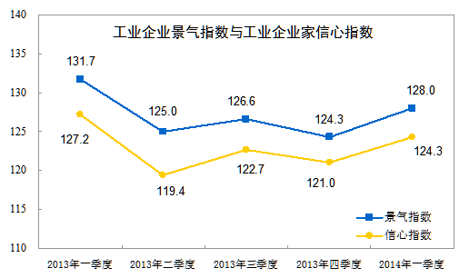 其中,反映工業企業當前景氣狀態的即期工業企業景氣指數為122.5,比去年四季度低6.1點;反映工業企業未來景氣預判的預期工業企業景氣指數為131.6,比去年四季度高10.2點。2014年一季度,工業企業家信心指數為124.3,比去年四季度高3.3點。