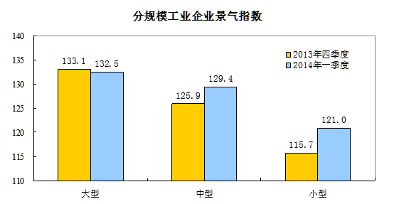 分企業規模看,大、中、小型工業企業景氣指數分別為132.5、129.4和121.0,分別比去年四季度下降0.6、上升3.5和上升5.3點。