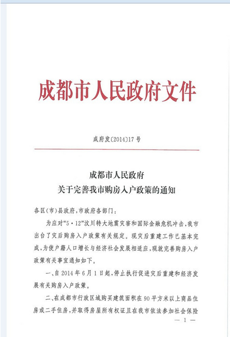 這份成都市人民政府的文件表示,為應對“5·1 2”汶川特大地震災害和國際金融危機衝擊,我市出臺了災後購房入戶政策有關規定。現災後重建工作已基本完成,為使戶籍人口增長與經濟社會發展相適應,現就完善購房入戶政策有關事宜通知如下。