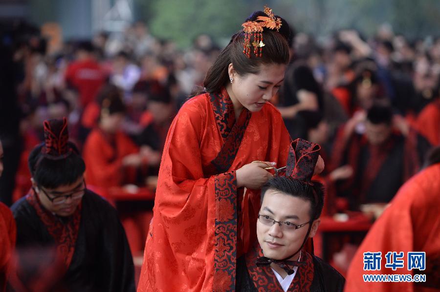5月9日,一名新娘將新郎的頭發剪下,完成“結發”之禮,即意味著兩人從此是夫妻。