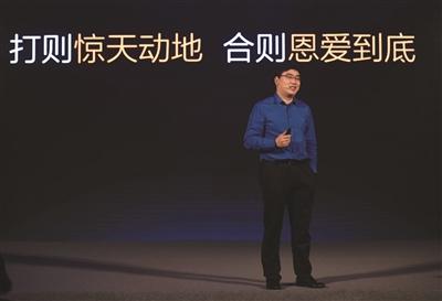 5月22日發布會現場,滴滴快的CEO程維訴說“愛恨情仇”。 徐媛園 攝