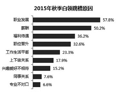 調查結果表明,2015年秋季白領跳槽原因中職業發展受限和不滿薪酬是首要的兩大原因,福利待遇和職位晉升也是促使白領跳槽的主要因素。但除了現實原因外,追求工作生活平衡也成為白領想跳槽的原因(如圖一)。