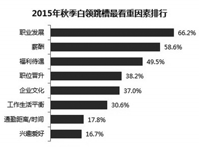職業發展是2015年白領選擇新工作最主要看重的因素,其次是薪酬、福利待遇和職位晉升。白領們對企業文化和工作生活平衡也非常看重(如圖二)。