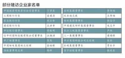 此外,中國建築材料集團有限公司董事長宋志平,長江三峽集團公司董事長盧純,三一集團董事長梁穩根、凱盛集團董事長彭壽也將隨行。