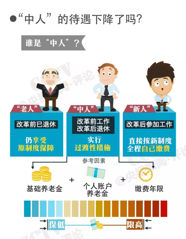 事實上,《關于機關事業單位工作人員養老保險制度改革的決定》明確,對“中人”通過實行過渡性措施,保持待遇水平不降低。即:在發給基礎養老金和個人賬戶養老金的基礎上,再依據視同繳費年限長短發給過渡性養老金。
