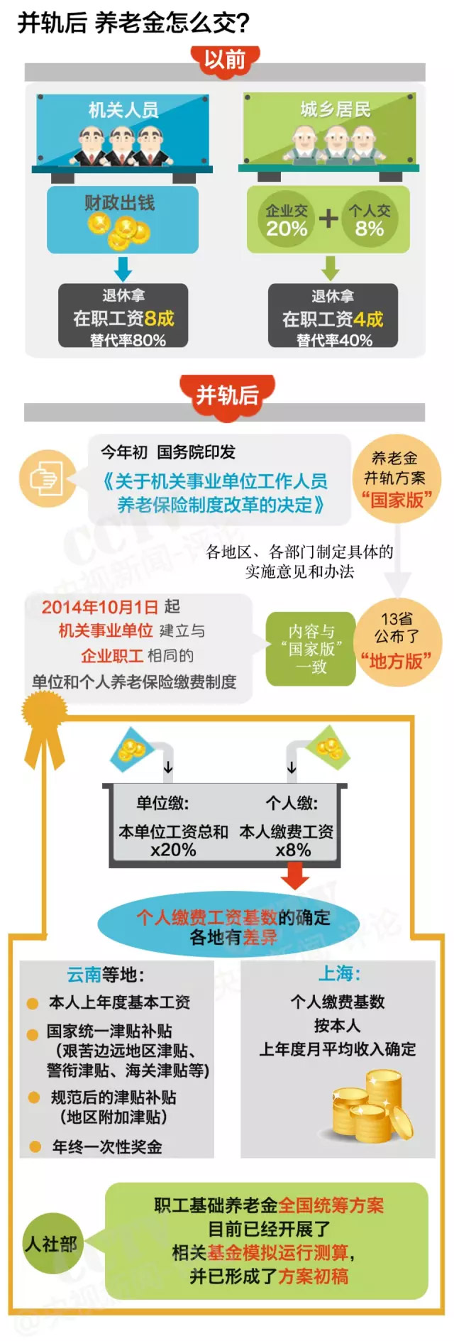 養老金並軌後,機關事業單位人員的養老金將不再由財政完全承擔,他們將與企業職工一樣,個人繳納部分養老保險。