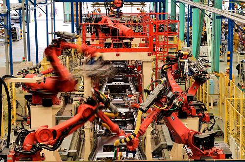 在威海南海新區德瑞博新能源汽車生產車間,工業機器人在進行焊接作業(11月14日攝)。“機器人是制造業皇冠頂端的‘明珠’。中國正加緊制定機器人產業‘十三五’發展規劃,助推本土機器人在研發、推廣應用以及標準體係建設等方面的發展。”工信部裝備工業司機械處處長王建宇日前在2015世界機器人大會新聞發布會上說。由中國科協、工信部和北京市政府共同主辦,中國電子學會等承辦的2015世界機器人大會將于11月23日至25日在京舉行。世界最先進的機器人和產學研領軍者在此雲集,圍繞“協同融合共贏,引領智能社會”的主題碰撞思想。新華社記者 郭緒雷 攝