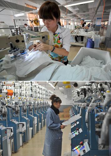 浙江紹興一家襪業企業“機器換人”後的車間已截然不同,往昔需要20多人的一個織襪車間(上圖,2012年9月9日攝),經過“機器換人”後如今只需要1名工人(下圖,2015年3月7日攝)。新華社記者 王定昶 攝
