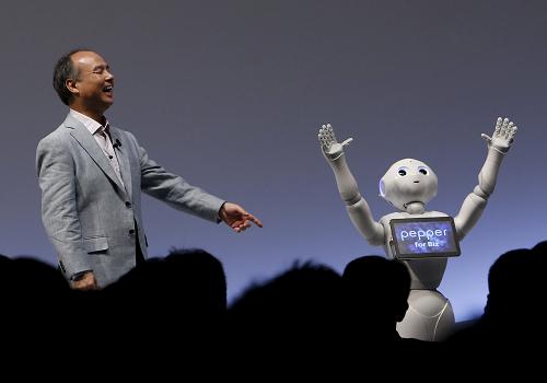 在日本東京舉行的2015年軟銀全球大會上,軟銀公司董事長兼首席執行官孫正義與該公司推出的類人型機器人“Pepper”互動(7月30日攝)。新華社/路透