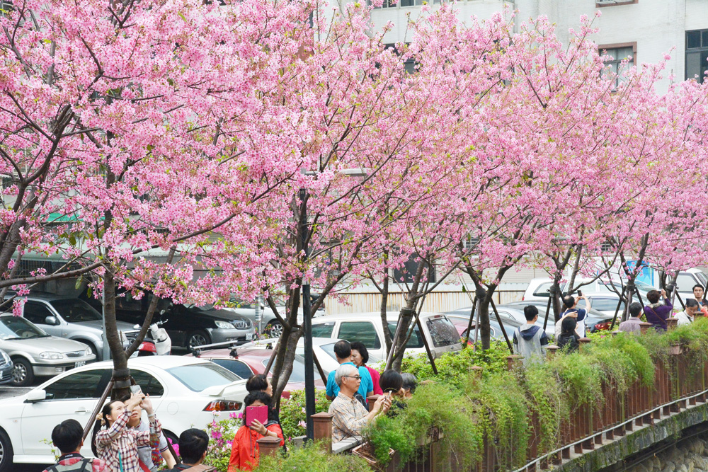 圖:新北市土城區“希望之河”廣場,為新北市內難得可坐捷運賞櫻花的景點,五日擠滿賞櫻人潮,民眾紛紛拿手機、相機與粉紅佳人一起留影。(圖片來源:臺灣“中央社”)