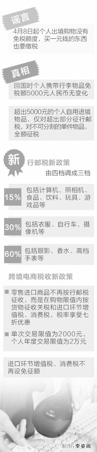 “這個說法是毫無根據的,無論是到境外旅遊、出差還是探親訪友,回國時個人攜帶行李物品免稅額5000元並沒有變化。”財政部有關人士表示,這次調整的主要是跨境電商零售進口商品稅收政策,以及行郵稅政策。進境居民旅客攜帶在境外獲取的個人自用、合理數量進境物品,總值在5000元人民幣以內(含5000元)的,海關予以免稅放行。