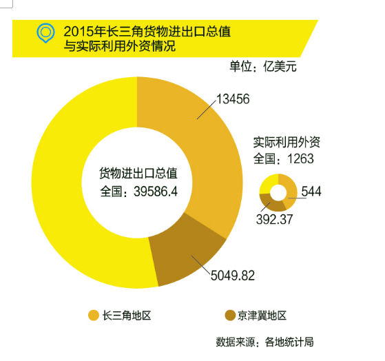 長三角城市群未來發展的第一大看點,是進出口能否回暖甚至“重回高地”。在進出口整體疲軟的情況下,上海自貿區今年一季度出現“逆勢增長”,進出口額增長了2.1%,其中出口增長了6.8%。在自貿區帶動下,上海今年一季度的進出口情況好于全國。長三角地區也一直是“進出口大戶”。貴陽大數據交易所的數據顯示,長三角地區2015年的貨物進出口總值佔全國的34.0%,而京津冀地區僅佔全國的12.8%。