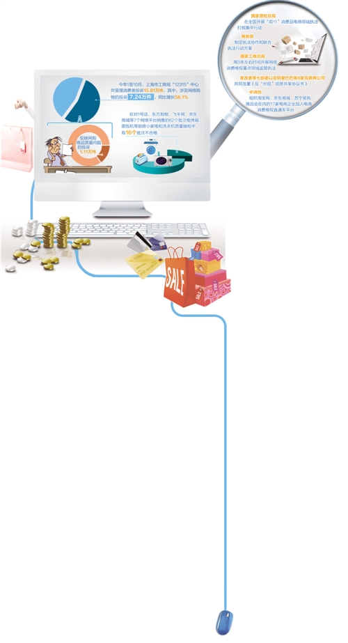 和先漲價再打折相比,假冒偽劣商品更令消費者頭疼。數據顯示,今年1至10月,上海市工商局“12315”中心共受理消費者投訴15.81萬件,同比增長17.6%;其中,涉及網絡購物的投訴7.24萬件,同比增長58.1%,反映網購商品質量問題的投訴1.11萬件,佔網購投訴的15.3%。在此前對1號店、東方購物、飛牛網、京東商城等7個網絡平臺銷售的62個批次電烤箱、面包機等廚房小家電和洗衣機質量抽檢中,有16個批次不合格,不合格檢出率高達25.8%。
