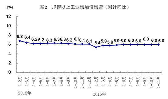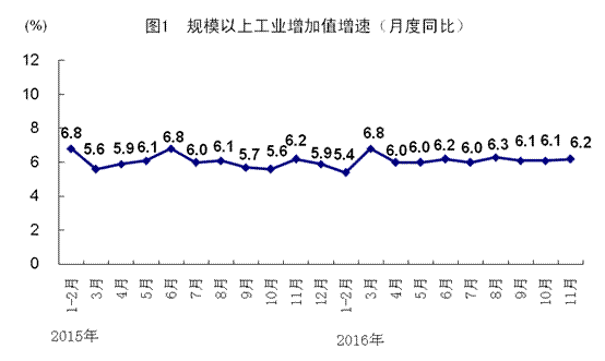 11月份,全國規模以上工業增加值按可比價格計算同比增長6.2%,增速比上月加快0.1個百分點,與上年同期持平。分經濟類型看,國有控股企業增加值同比增長4.2%,集體企業下降4.4%,股份制企業增長6.6%,外商及港澳臺商投資企業增長5.6%。分三大門類看,採礦業增加值同比下降2.9%,制造業增長6.7%,電力、熱力、燃氣及水生產和供應業增長9.9%。工業結構繼續優化,高技術產業和裝備制造業增加值同比分別增長10.6%和10.5%,增速分別比規模以上工業快4.4和4.3個百分點。規模以上工業企業產銷率達到97.8%。從環比看,11月份全國規模以上工業增加值比上月增長0.51%。1-11月份,規模以上工業增加值同比增長6.0%。