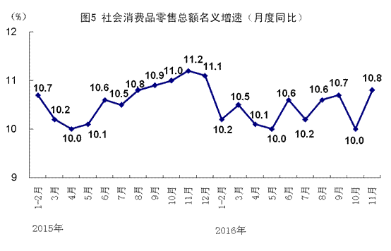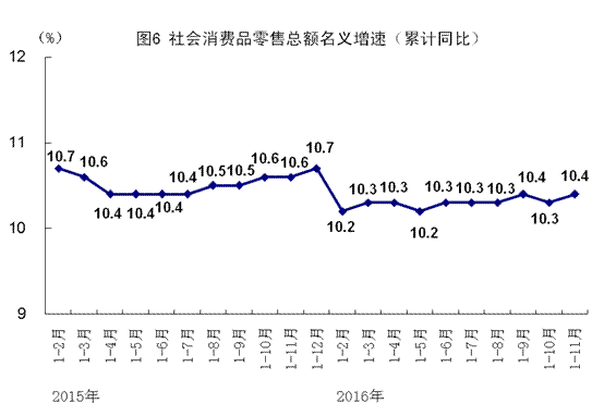 11月份,社會消費品零售總額30959億元,同比名義增長10.8%(扣除價格因素實際增長9.2%),增速比上月加快0.8個百分點。按經營單位所在地分,城鎮消費品零售額26748億元,同比增長10.8%;鄉村消費品零售額4210億元,增長11.0%。按消費類型分,餐飲收入3342億元,同比增長10.1%;商品零售27617億元,增長10.9%,其中限額以上單位商品零售13940億元,增長9.8%。消費升級類相關商品增勢較好,通訊器材增長17.8%,文化辦公用品增長15.4%,家用電器和音像器材增長14.7%,汽車增長13.1%。從環比看,11月份社會消費品零售總額比上月增長0.97%。1-11月份,社會消費品零售總額同比增長10.4%。