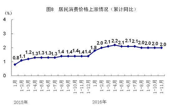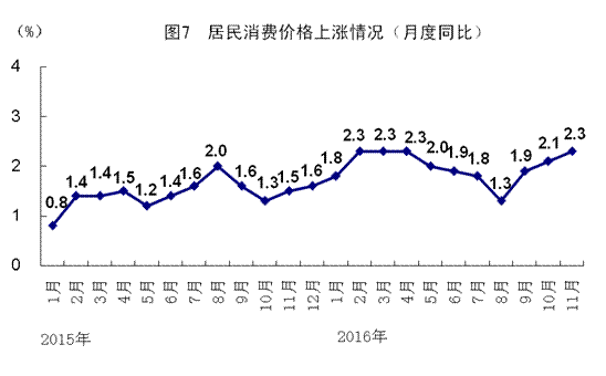 11月份,居民消費價格同比上漲2.3%,漲幅比上月上升0.2個百分點。1-11月份,居民消費價格同比上漲2.0%。分類別看,11月份,食品煙酒價格同比上漲3.2%,衣著上漲1.4%,居住上漲2.0%,生活用品及服務上漲0.3%,交通和通信價格持平,教育文化和娛樂上漲2.2%,醫療保健上漲4.4%,其他用品和服務上漲4.2%。在食品煙酒價格中,糧食價格上漲0.7%,豬肉價格上漲5.6%,鮮菜價格上漲15.8%。從環比看,11月份居民消費價格比上月上漲0.1%。