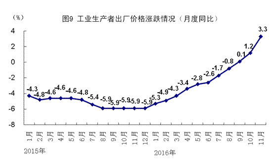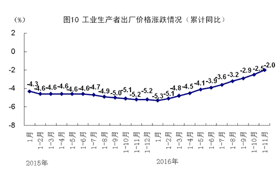 11月份,工業生產者出廠價格同比上漲3.3%,漲幅比上月擴大2.1個百分點;環比上漲1.5%。1-11月份,工業生產者出廠價格同比下降2.0%。11月份,工業生產者購進價格同比上漲3.5%,環比上漲1.8%。1-11月份,工業生產者購進價格同比下降2.7%。