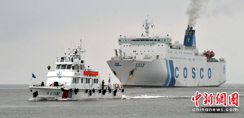 海巡艇為中遠之星護航進港。葉雲強 攝