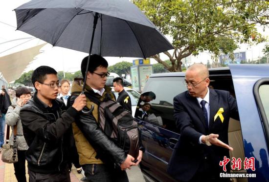 2月11日中午,于2月4日臺灣復興航空空難中遇難的福建南平政和人何永生的骨灰,由其兒子何遠彬、女兒張桂珠護送,從臺北抵達福州,回到了故鄉。受福建省民政部門所囑,福州市圓滿生命關懷服務中心工作人員胸佩黃絲帶,手執黑傘和鮮花,在福州長樂機場等候接靈護靈。中新社發 劉可耕 攝