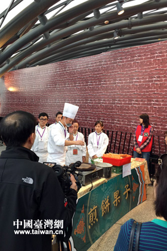 廟會現場很多小朋友圍在捏面人的攤位前,躍躍欲試地向來自北京的民間藝人討教面人的制作方法;羊肉串、煎餅果子、烤鴨等美食攤位也被圍得水泄不通。臺北市民們扶老攜幼,邊吃邊逛邊拍照,會場洋溢著歡樂的年節氣氛。