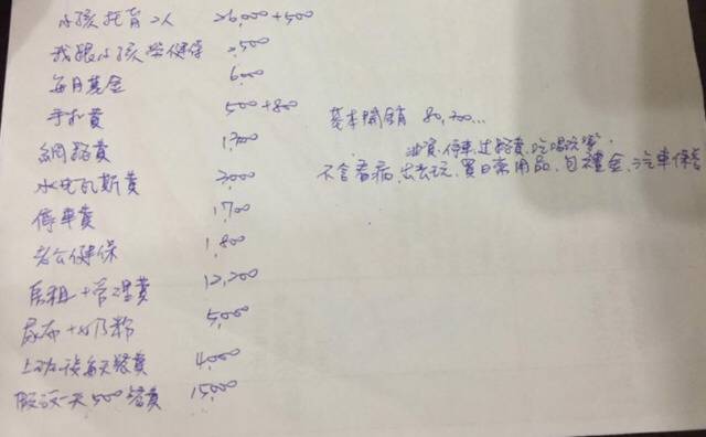 根據這張支出表顯示,“小孩托育2人共26500元,老公健保1800元,妻與孩子勞健保2500元,基金6千元,手機費共1300元,網路1300元,水電瓦斯3000元,停車費1700元,房租管理費12200元,尿布奶粉5000元,上班後每天餐費4000元,假設一天500餐費共1.5萬元,基本開銷80300元。”
