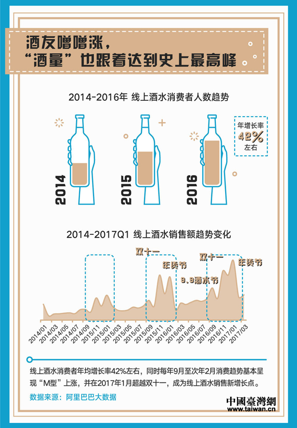 9月5日,天貓聯合第一財經商業數據中心發布了《中國人的酒杯——2017天貓酒水線上消費數據報告》。數據顯示,酒水線上消費已進入高速增長期,消費人數年增速高達42%,其中有8成交易來自移動端。天貓已經成為酒水線上銷售的主力平臺,帶動了酒業實現了40%的銷售增長。(中國臺灣網發 阿里巴巴供圖)