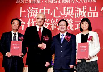 誠品生活與上海中心于上午共同宣布簽署《租賃意向協議》,誠品生活將于2015年正式進駐上海浦東陸家嘴的上海中心大廈。誠品生活董事長吳清友(左二)、誠品生活總經理吳旻潔(右一)一同出席簽約儀式。圖片來自;臺灣《聯合晚報》