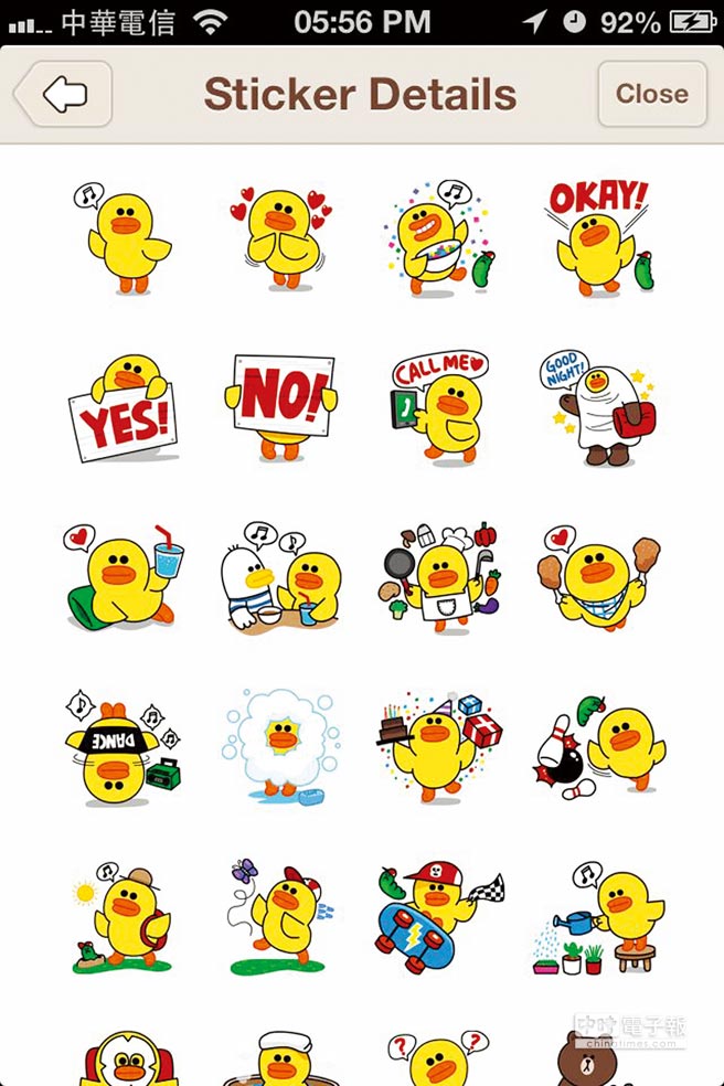 通訊軟件LINE的黃色小鴨Sally貼圖。(來源:臺灣《中國時報》)