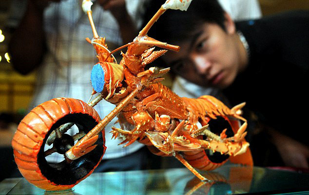 據英國《每日郵報》9月14日報道,來自中國臺灣地區的廚師及食物藝術專家黃明博(音),因不忍心扔掉食物色彩鮮亮的外殼,于是大膽創新,充分利用每一寸龍蝦的外殼,巧手打造出了一係列迷你版的摩托車模型。在福建省舉行的食品藝術研討會上,黃明博的作品令在場的觀眾驚嘆不已。