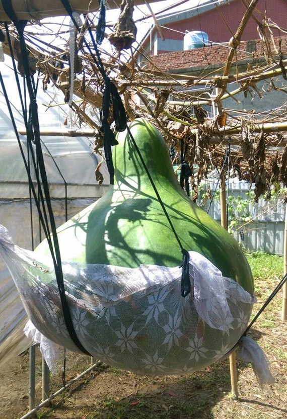 臺灣苗栗縣農民徐滄浩專門種植大南瓜,素有“南瓜王子”稱號,今年改種瓠瓜,種出的瓠瓜腰圍竟也寬達186厘米,附近居民嘖嘖稱奇。臺灣“中央社”/記者管瑞平攝