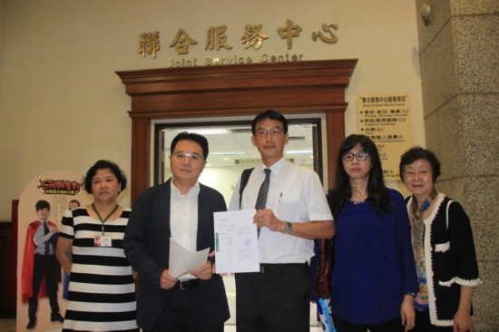 臺南市府法制處長蕭博仁(左二)、消基會南區分會律師郭家駿(右三)等人今天代表維冠金龍受害者到臺南地院遞起訴狀,求償包括懲罰性違約金共8億余元新臺幣。(圖片來源:臺灣《聯合報》)