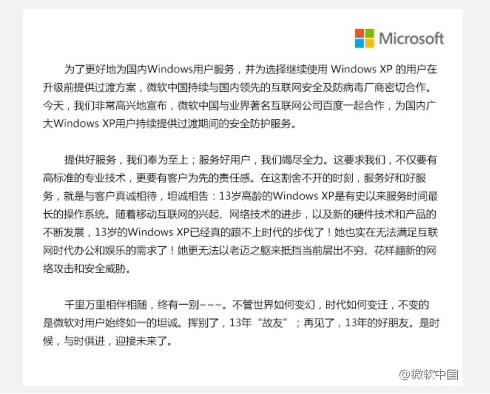 中新網3月27日電 3月27日,微軟中國和百度共同宣布為國內XP用戶提供過渡期間的安全防護服務,推出以陣列雲技術為基礎的XP聯合防護方案。該方案將為Windows XP用戶提供風險護盾、黑客防禦、極速運行、服務安全優化四大服務,能有效提供Windows XP的整體防護能力,尤其是保護XP用戶的支付安全。該方案是微軟首次與國內安全廠商深入合作,為中國用戶提供XP防護解決方案。