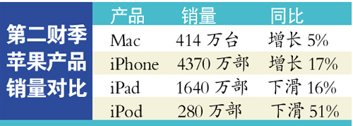 數據顯示,第二財季蘋果共售出414萬臺Mac,比去年同期增長5%;共售出4370萬部iPhone,比去年同期增長17%;共售出1640萬部iPad,比去年同期下滑16%;共售出280萬部iPod,比去年同期下滑51%。按照地域劃分,蘋果公司第二財季美洲部門營收為143.10億美元,比去年同期的140.52億美元增長2%;大中華區營收為92.89億美元,比去年同期的82.13億美元增長13%。本報訊 (記者段郴群)