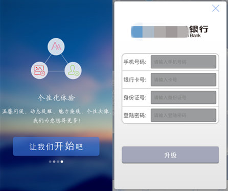 360手機安全專家介紹,“手銀毒王”木馬高倣某銀行手機客戶端誘導手機用戶下載,安裝打開後,其主界面的引導頁和正版手機銀行客戶端完全一樣,此後,該木馬會以軟件升級為由,誘導用戶填入手機號和銀行卡號等信息,並將這些信息以短信形式發送到“132****5766”的手機號上。
