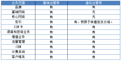 表1 虛擬運營商與基礎運營商業務范圍對比