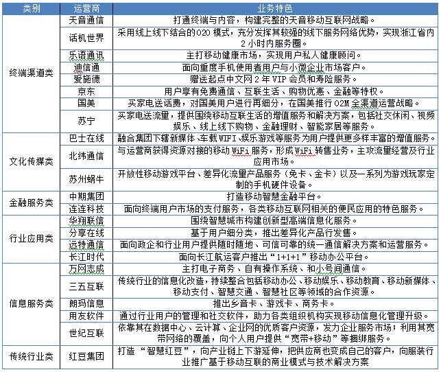目前,已經有20多家企業公布了自己的虛擬運營業務發展重點。通過梳理後不難發現,試點企業都力圖將虛擬運營業務特色與主營業務結合,完善企業業務生態圈。